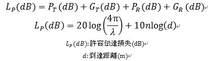 用以上公式表达。在给定条件下的最大通信距离是通信能量等于传输损耗的极限点。 换句话说,可以通过找到传输/接收功率+传输/接收天线增益之和与传输损耗值相等的距离来计算理论最大通信距离。可允许的损耗上限设为LP,而对应的理论最大通信距离设为d的话,可从式(6)及公式(8)导出