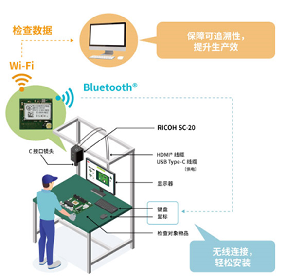 RICOH SC-20 相机本体相当于一台独立计算机,需通过鼠标和键盘完成操作。但工厂作业单元的操作台空间十分有限,设备布局本就局促;加之相机通常安装在较高位置,有线连接不仅会产生线缆杂乱干扰作业的问题,还需配备超长线缆的键盘和鼠标设备。基于此,市场对支持蓝牙®协议、可无线操控的需求应运而生。