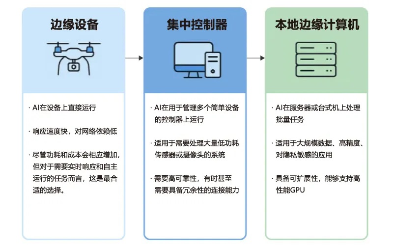 这些终端设备通常具有小型化、低功耗、低成本的特点,因此难以内置AI推理功能。尤其是在大量终端设备执行轻量级任务的情况下,这一特点更为显著。在此类场景中,由终端设备发送的数据以及对它们的控制指令,在集中控制器中进行处理更为高效。这类控制器在配置上可能接近工业计算机或台式电脑。